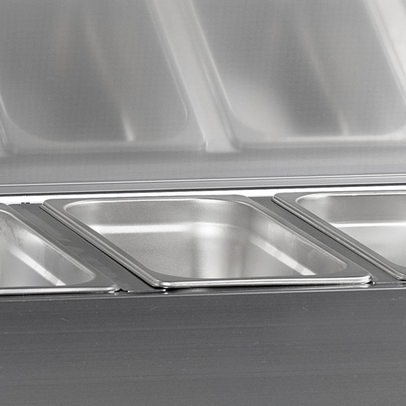 Řada chladicích nástaveb GVC33 S/S je skvělým doplňkem gastro pultů, protože vám umožňuje mít na dosah vše, co potřebujete k přípravě jídla. Je vhodná pro gastronádoby GN 1/4 x 150 mm (nejsou součástí) GVC33-120: 5 x GN 1/4 GVC33-150: 7 x GN 1/4 GVC33-180: 9 x GN 1/4 GVC33-200: 10 x GN 1/4